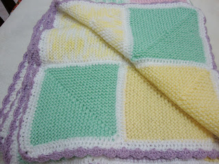 Depois de tricotar os 110 quadrados de que precisava, fiz em volta de cada um, uma carreira de ponto baixo em crochê.